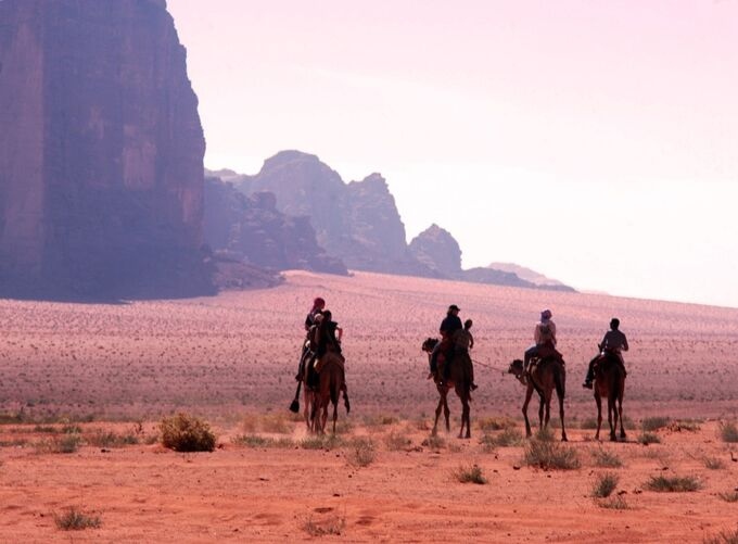 • ワディラム砂漠でラクダツアーを楽しむ観光客